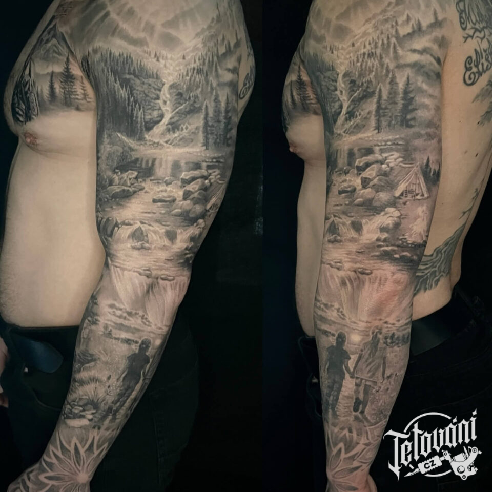 Tetování příroda, les, hory, děti na rukáv