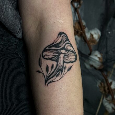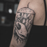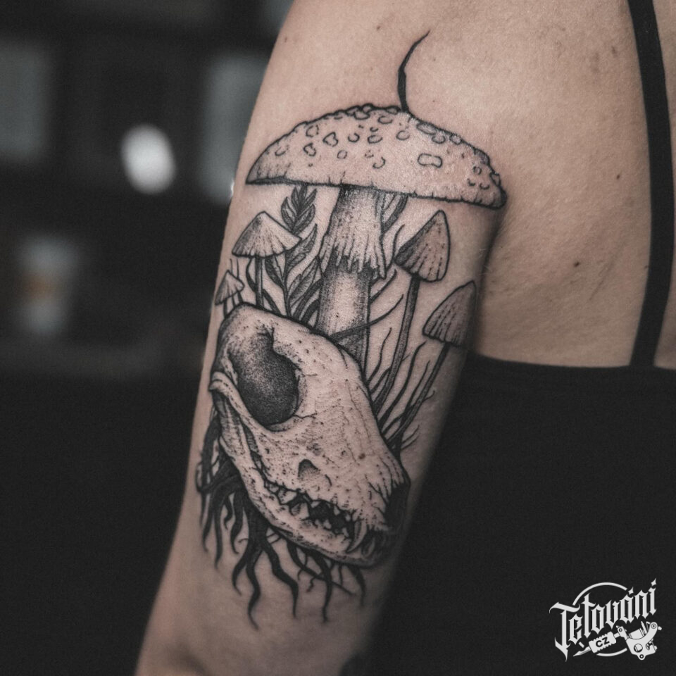 Tetování příroda, les, hřiby, zvířecí lebka na rameno