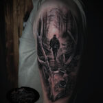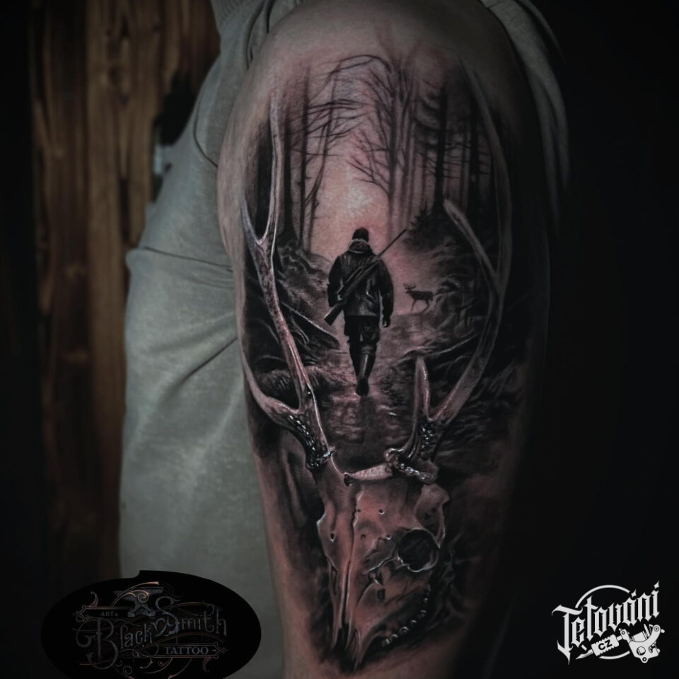 Tetování příroda, les, lebka jelena na rameni
