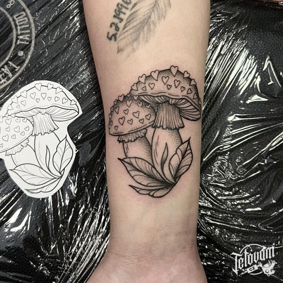Tetování příroda, les, mochomůrky na předloktí