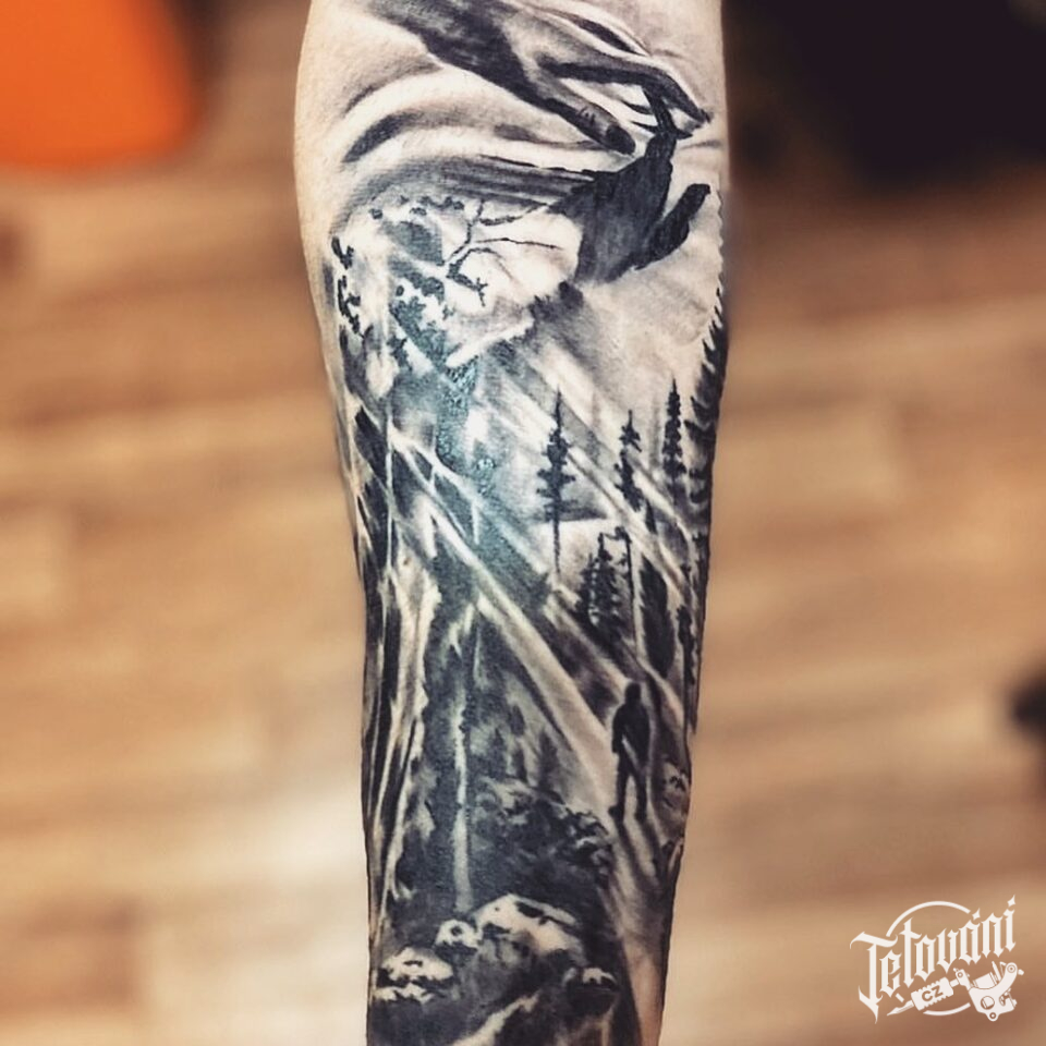 Tetování příroda, les na předloktí