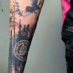 Tetování příroda, les, pták a znaky a symboly, symbol valknut na předloktí