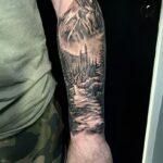 Tetování příroda, les s horama na předloktí