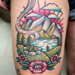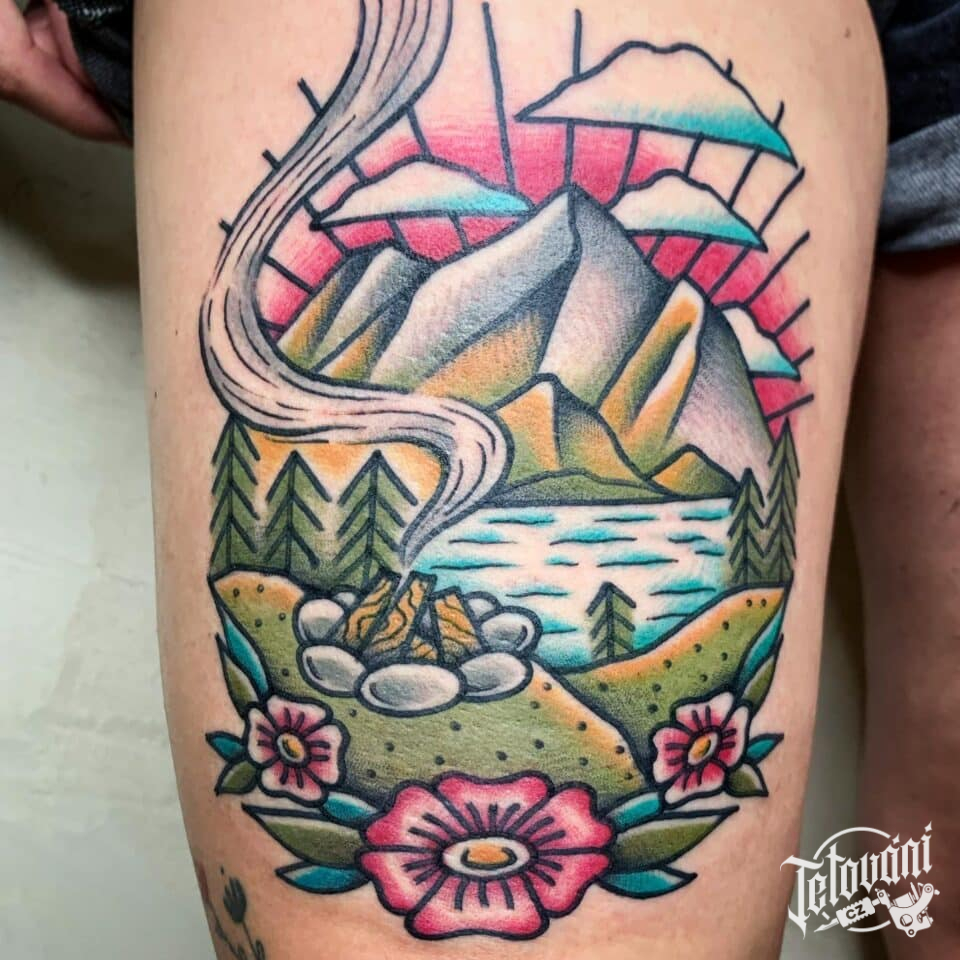 Tetování příroda, les s horama na stehně