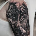 Tetování příroda les, zvířata, kůň a vlk na rameni