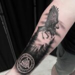 Tetování příroda, les, zvířata orel a znaky a symboly, symbol valknut na na předloktí
