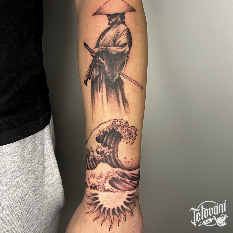 Tetování příroda, moře, Slunce, samuraj na předloktí