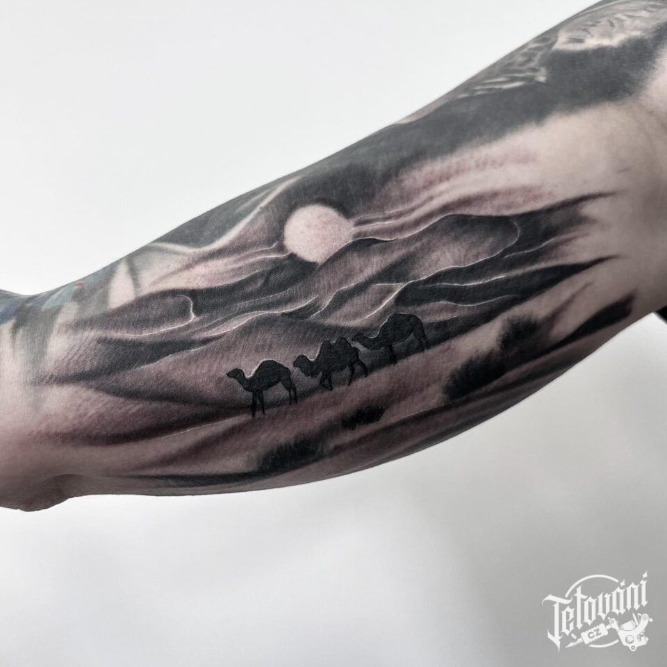 Tetování příroda, poušť a velbloudy, zvířata na rameno