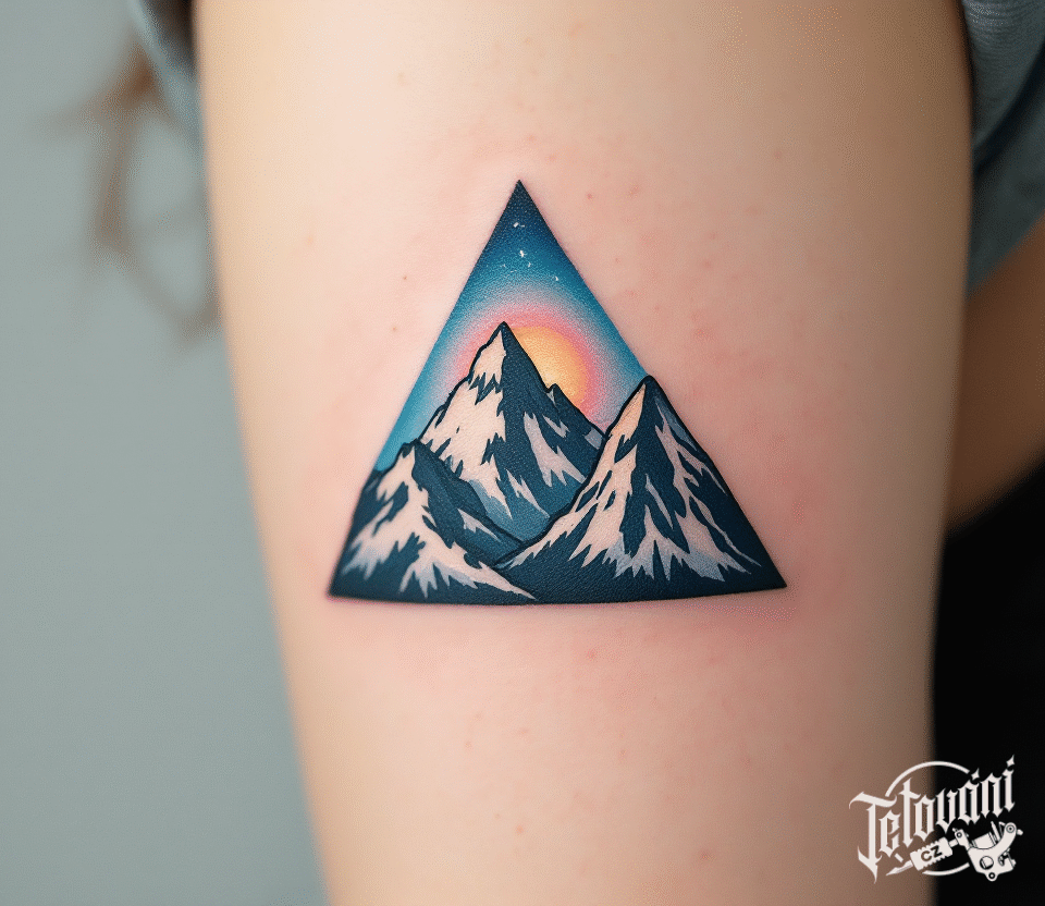 Tetování příroda, tvary, Slunce a hory v trojúhelníku na stehně