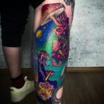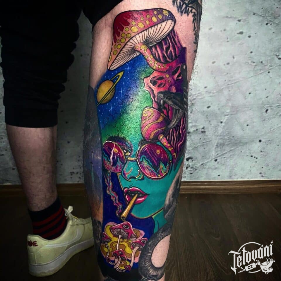 Tetování příroda, vesmír, portrét na lýtku