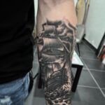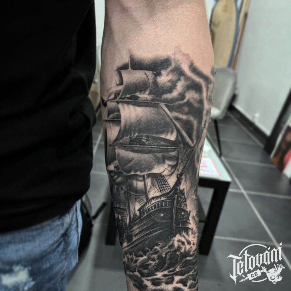 Tetování příroda živly loď na moři na předloktí