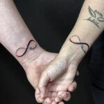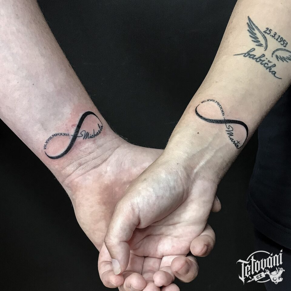 Tetování pro páry, ležatá osmička, nekonečno láska, jména a čísla na zápěstí