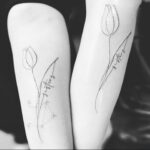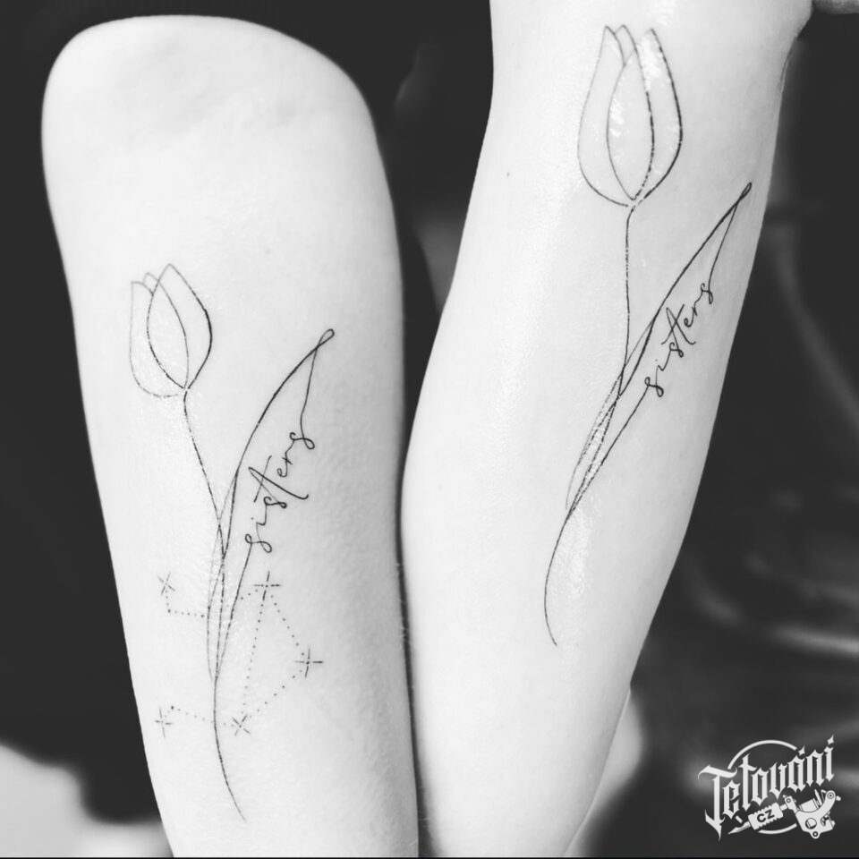 Tetování pro sestry, společné tetování, květiny, tulipán a nápisy na rameno