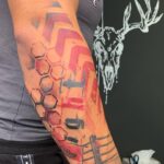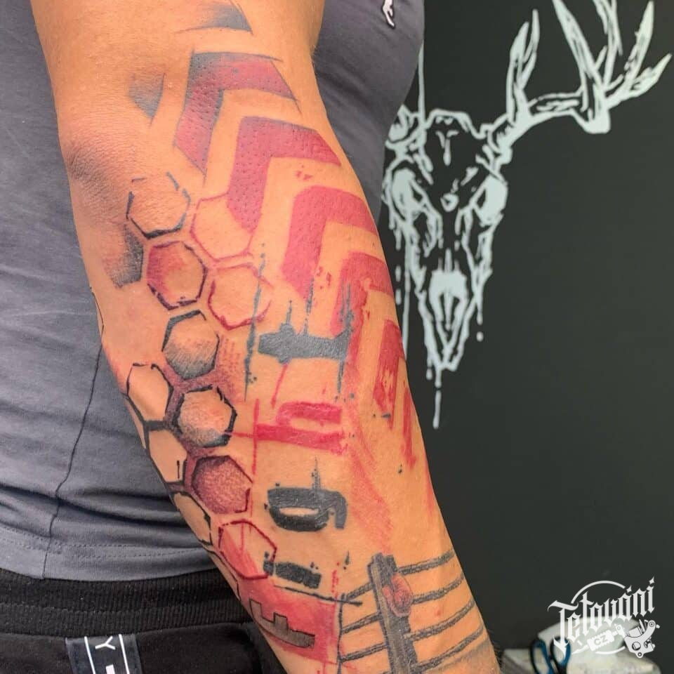 Tetování pruhy, tvary a písmena na předloktí