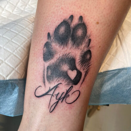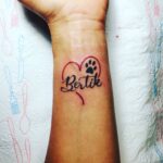 Tetování psí tlapa, jméno a srdce na předloktí