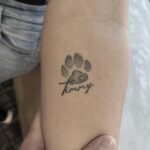 Tetování psí tlapka a jméno na předloktí