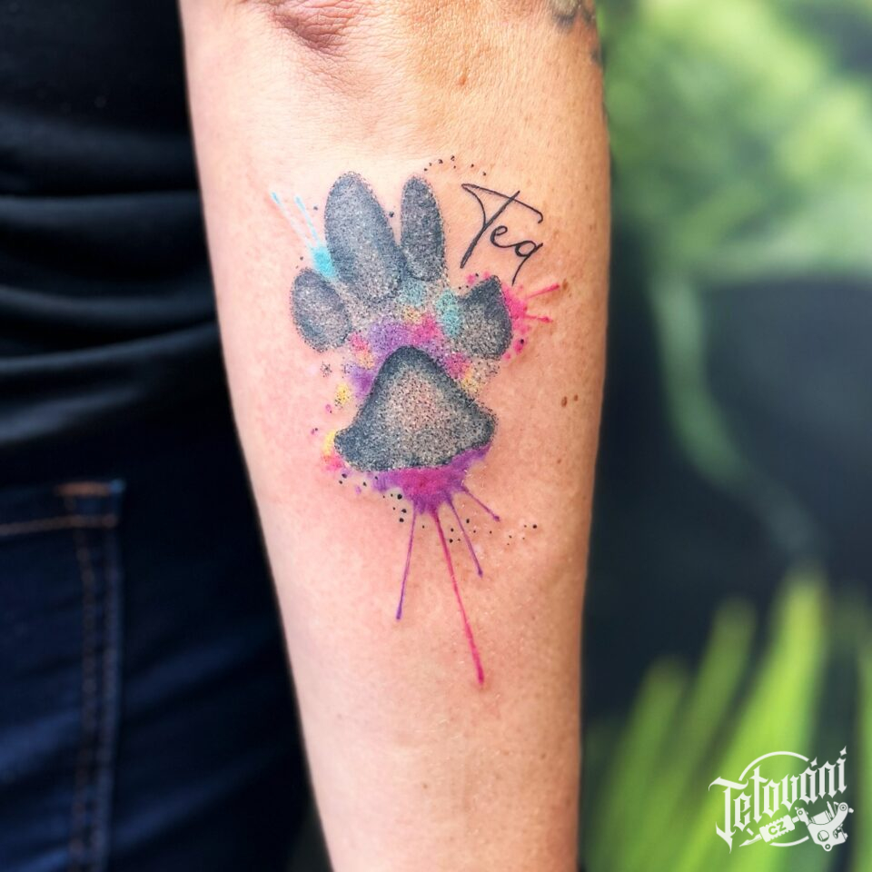 Tetování psí tlapka a nápisy, jméno na předloktí