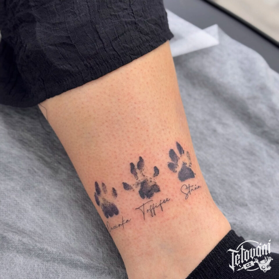Tetování psí tlapky na holeň