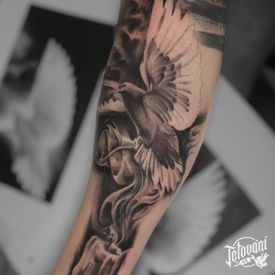 Tetování ptáci, holubice a znaky a symboly, svíčka na předloktí