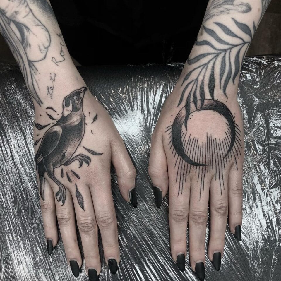 Tetování pták a Měsíc na hřbet ruky