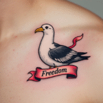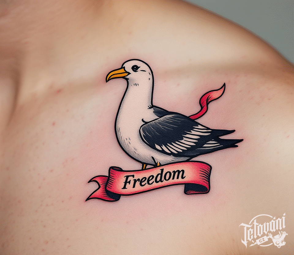 Tetování pták albatros s nápisem pod klíční kost