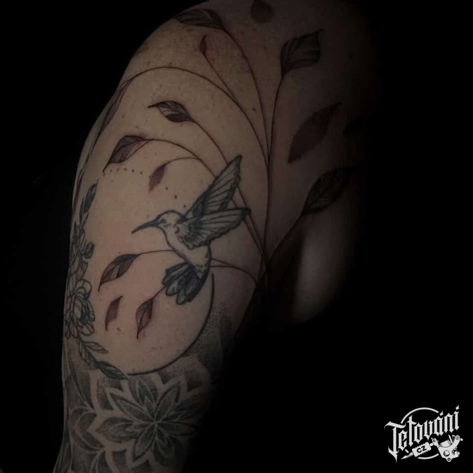 Tetování pták, kolibřík, květiny a mandala na rameni