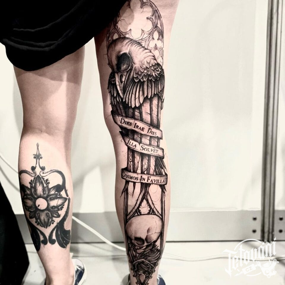 Tetování pták, lebka a nápisy, symbol smutku na nohu