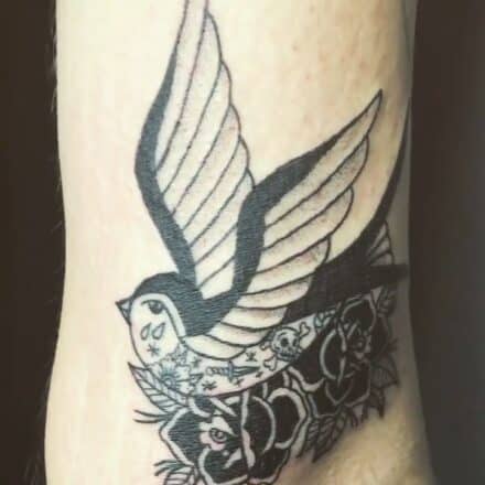 Tetování pták, maska, znaky a symboly na lýtko