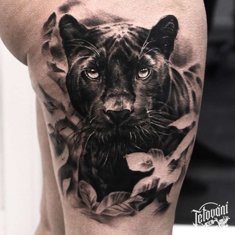 Tetování puma, zvíře, portrét, květiny na bok stehna