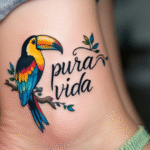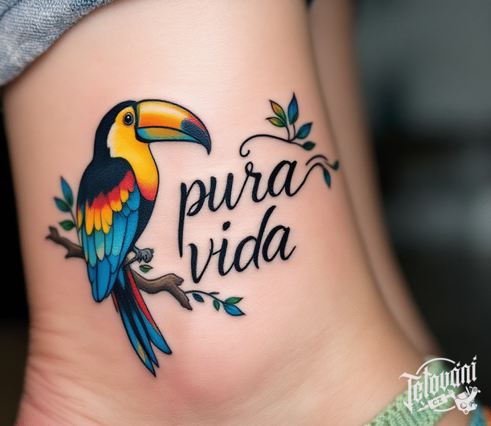 Tetování pura vida, nápis, pták na kotník
