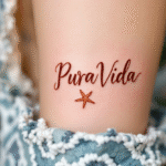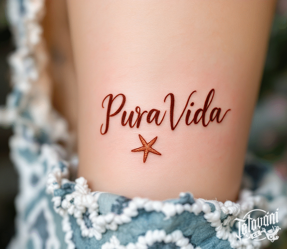Tetování pura vida nápis s mořskou hvězdicí na rameno