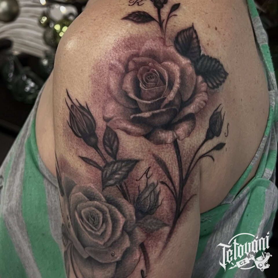 Tetování realistické růže s iniciály na rameni