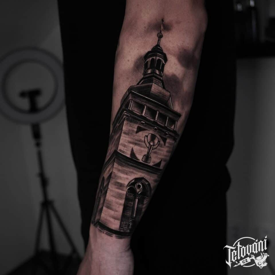 Tetování realistika, náboženství kostel, cestování na předloktí