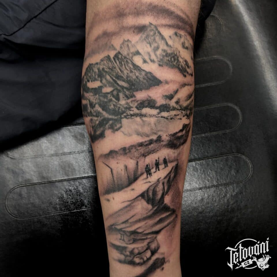 Tetování realistika, příroda, hory na předloktí
