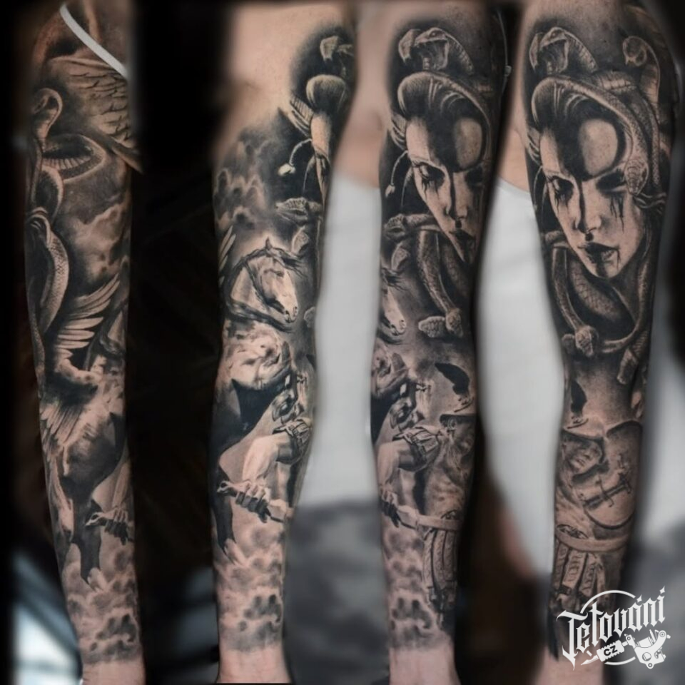 Tetování řecká mytologie, mýtická medúza na rukávu