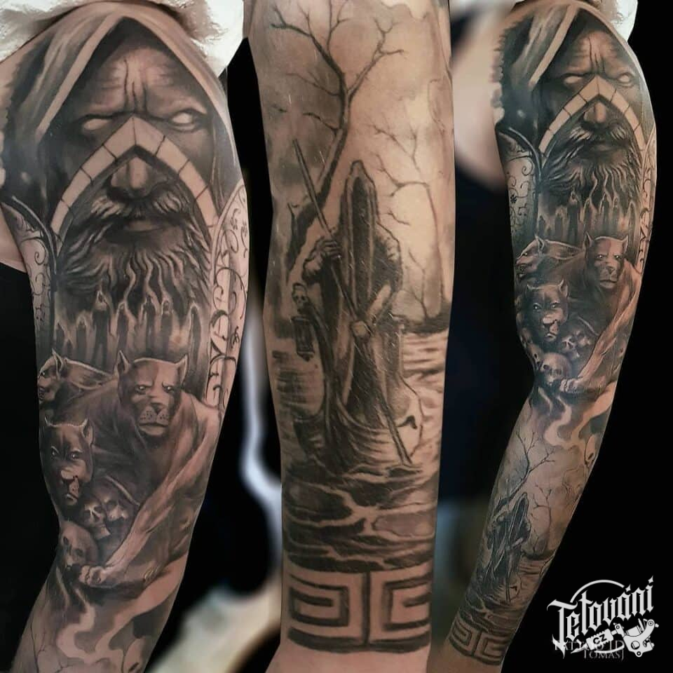 Tetování řecká mytologie, mýtické bytosti, Hádés, Kerberos, Charón, rukáv