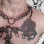 Tetování řetěz, anděl s ďáblem, srdce na hrudníku
