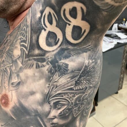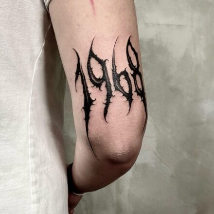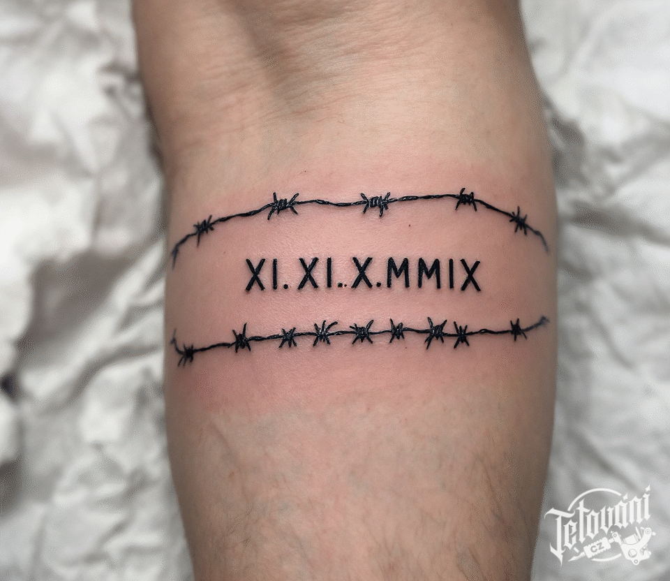 Tetování římská čísla, datum, písmena, ostnatý drát na předloktí