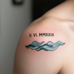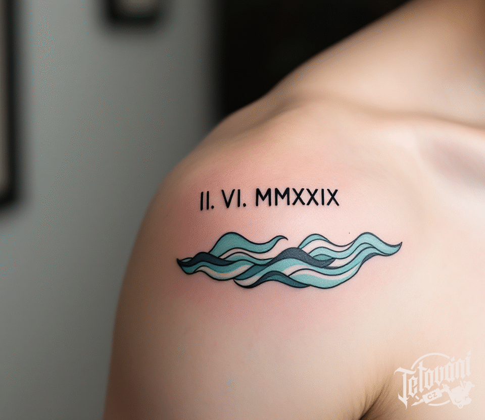 Tetování římská čísla, nápis, datum narození, písmena, s vlnou na rameno