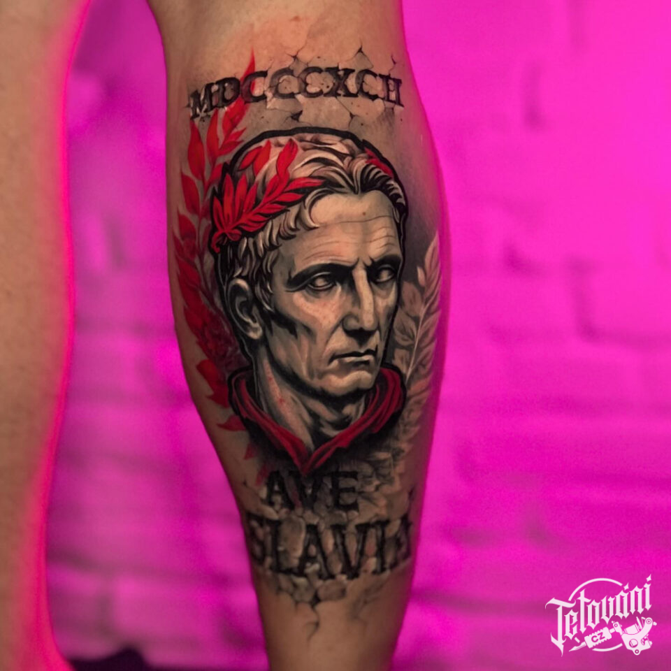 Tetování římská mytologie, portrét Ave Caesar na lýtko