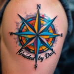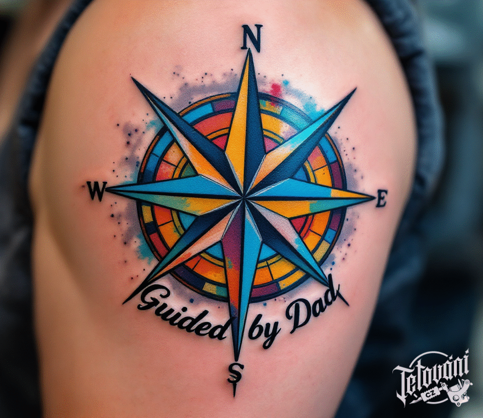 Tetování rodiče, nápis s kompasem na rameno
