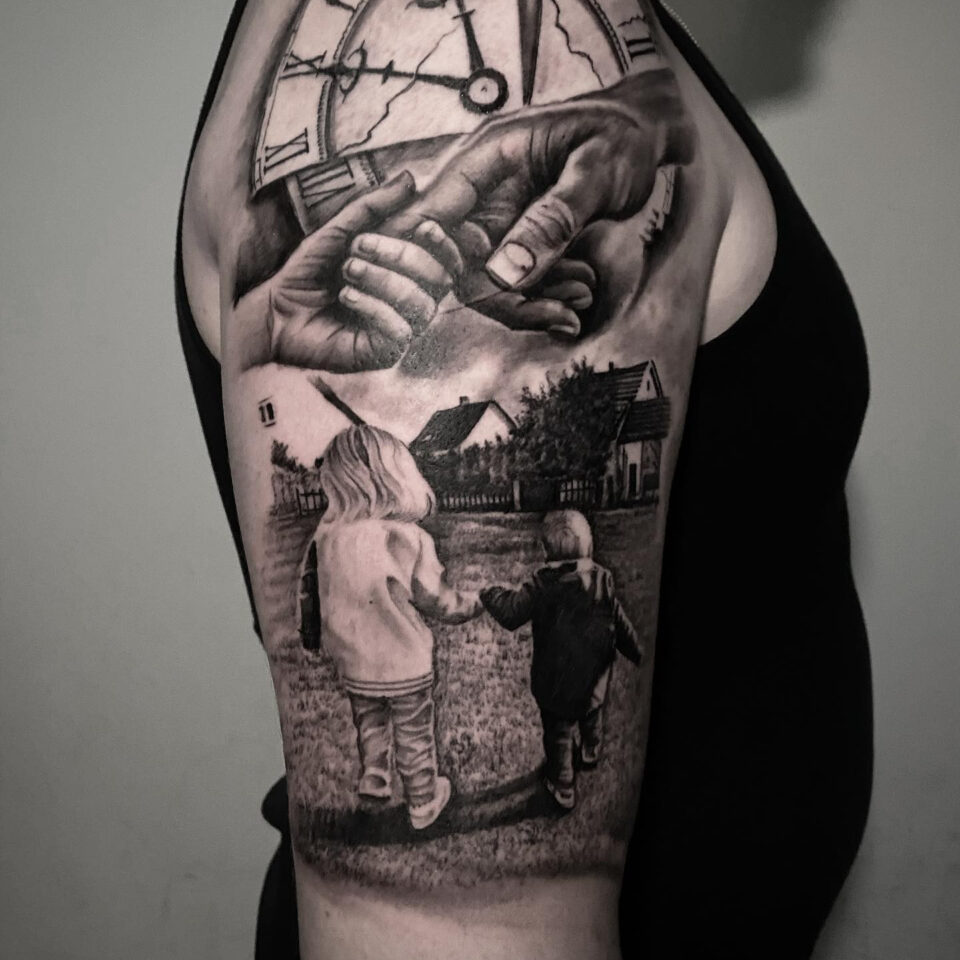 Tetování rodina, děti, hodiny a ruce na rameni