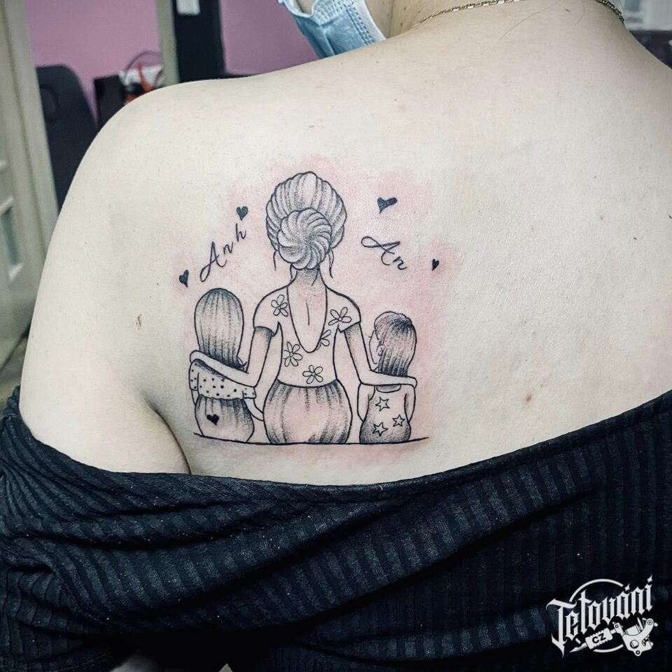 Tetování rodina, žena a děti na lopatce