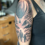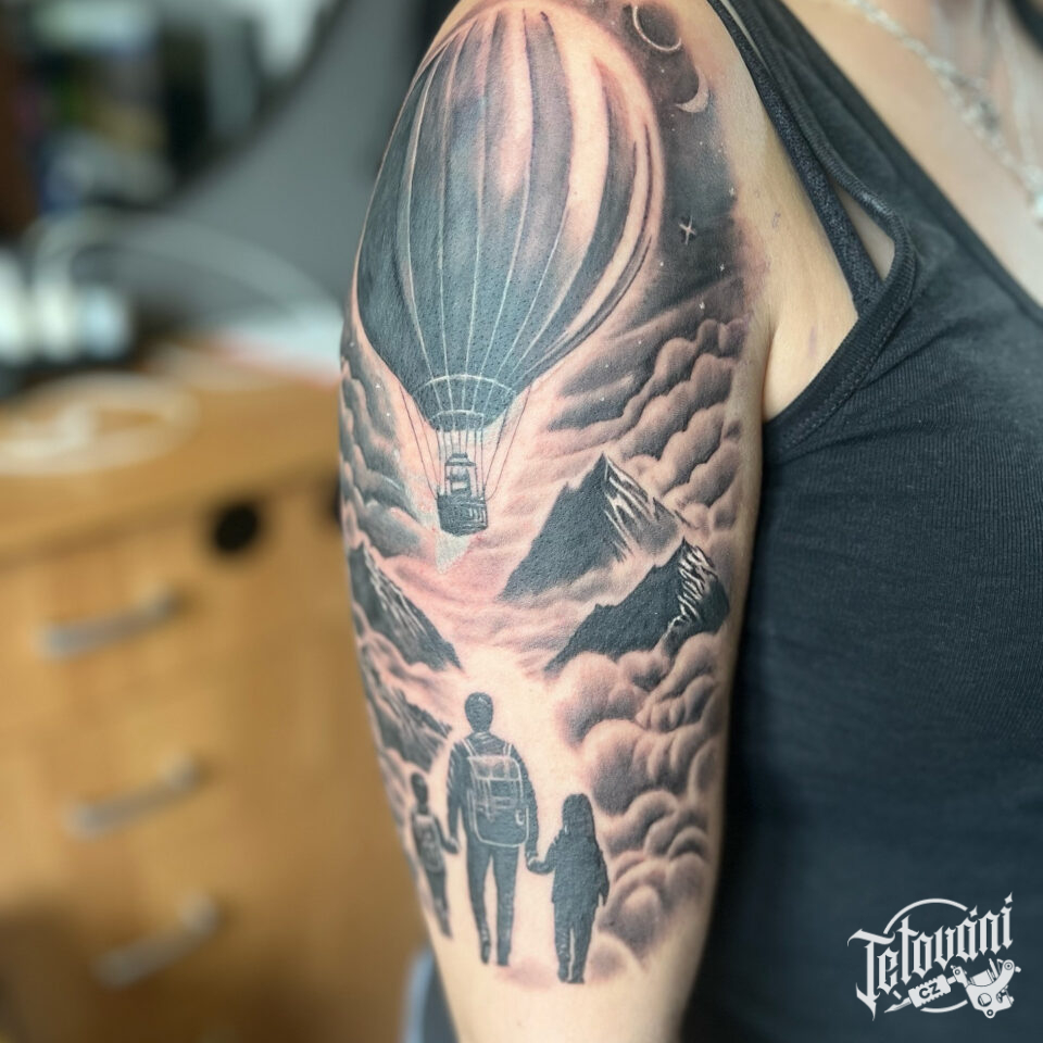 Tetování rodina, děti, příroda hory, létající balón na rameno
