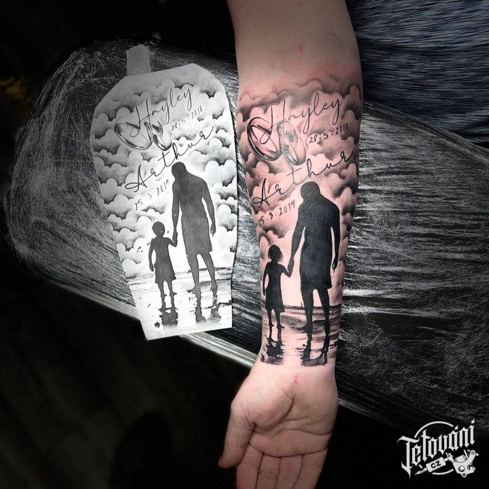 Tetování rodina, nápisy, jména a svatební tetování, prsteny na předloktí