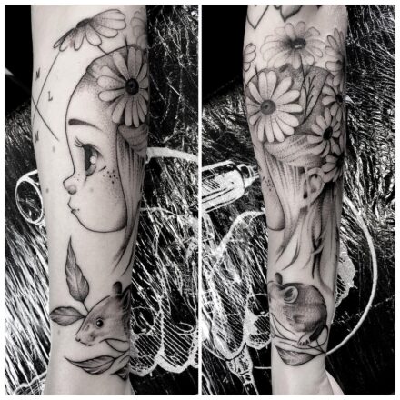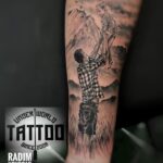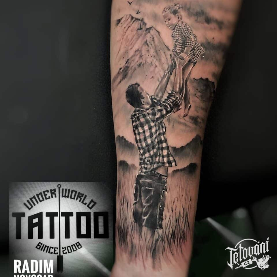 Tetování rodina, otec s dítětem na předloktí