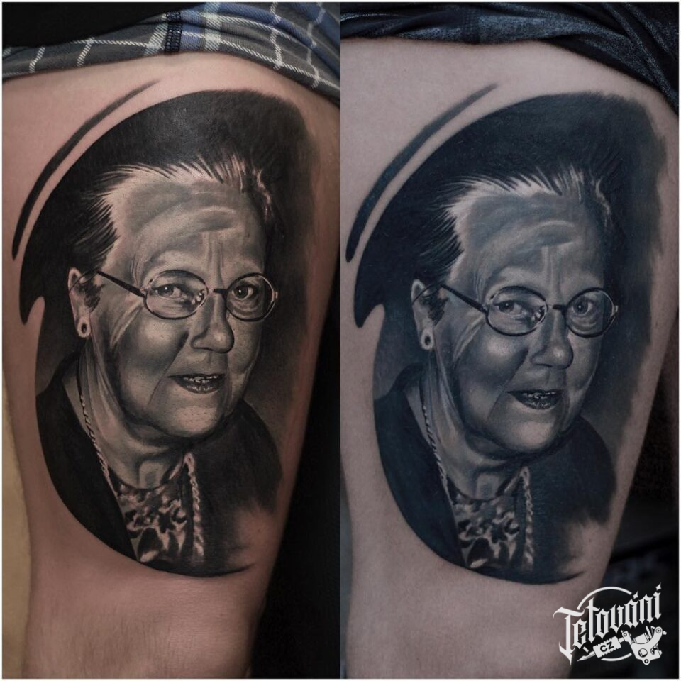 Tetování rodina, portrét na stehně