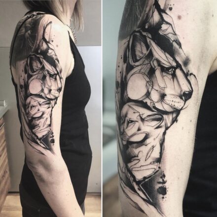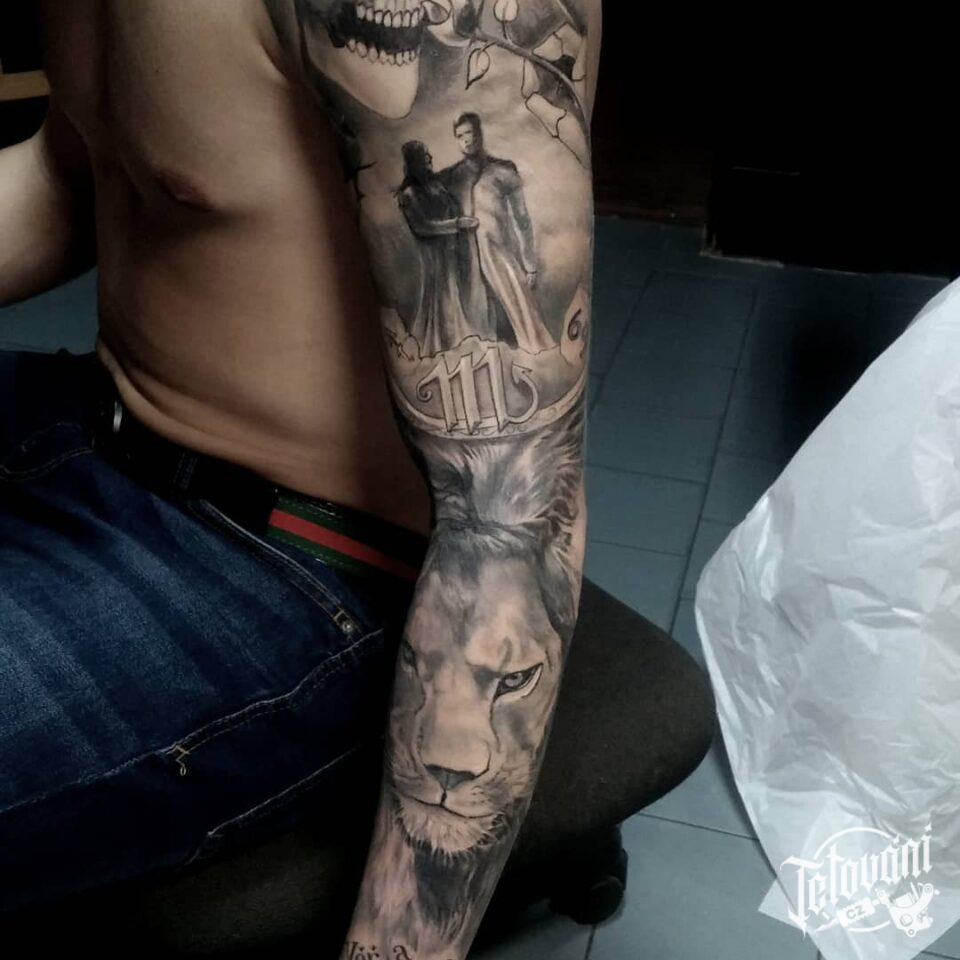 Tetování rodina, žena a muž, zvíře, lev, smrt, štír znamení zvěrokruhu, rukáv