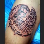 Tetování rodina, žena anděl a dítě, nápisy, jména a datumy na rameno
