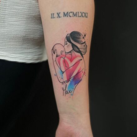 Tetování rodina, žena nesoucí dítě na zádech